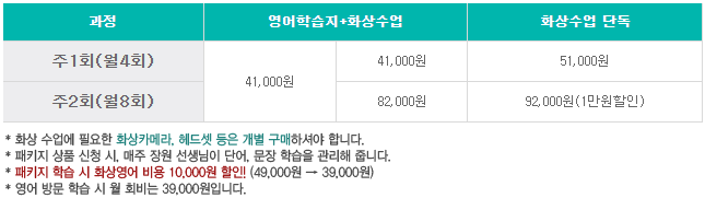 | 교육비 | 53,000원(월4회, 1회20분 기준)패키지 및 프리미엄 학습 시 할인 적용 |