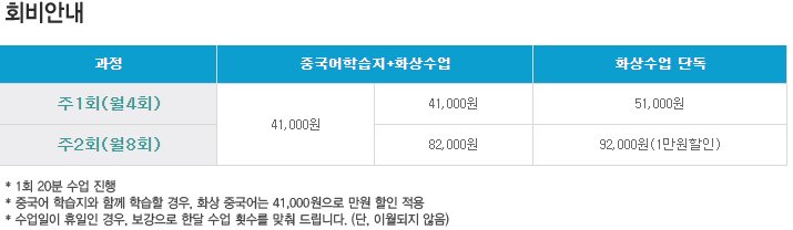 | 교육비 | 53,000원(월4회, 1회20분 기준)패키지 및 프리미엄 학습 시 할인 혜택 |