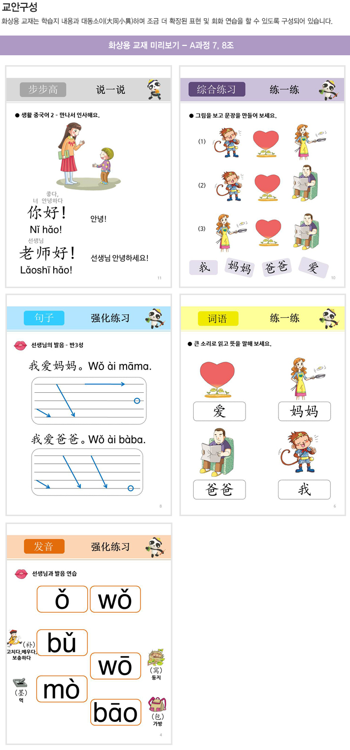 | 교재구성 | A~K 과정(장원 중국어 학습지를 기반으로 한 교재) |