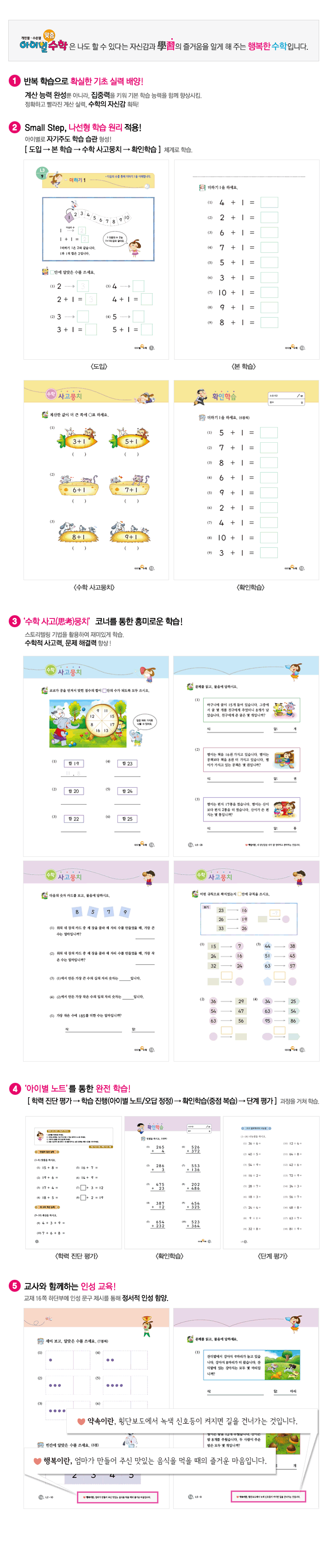 | 교재구성 | 수준에 맞게 맞춤 진도를 결정하여, 결손 학습 없이 완전 학습을 이끌어 내는 구성 |